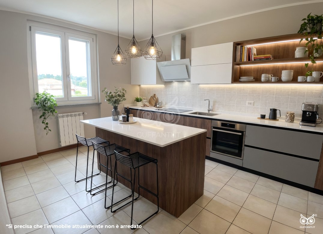 Appartamento centrale composto da piano primo e piano mansardato, soggiorno, cucina abitabile, due bagni, due camere con box e cantina al piano interrato. Classe energetica A2, prestazione energetica 41,07 KWh/mqannuo.