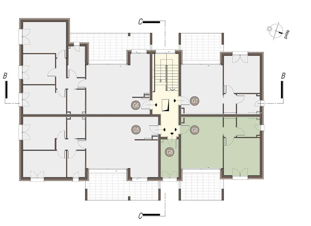 Quadrilocale a Piano Primo composto da soggiorno-cottura, tre camere, due bagni e due disimpegni. Terrazzo di mq. 26,76. Classe energetica A4, prestazione energetica 35,75 kWh/mqannuo.