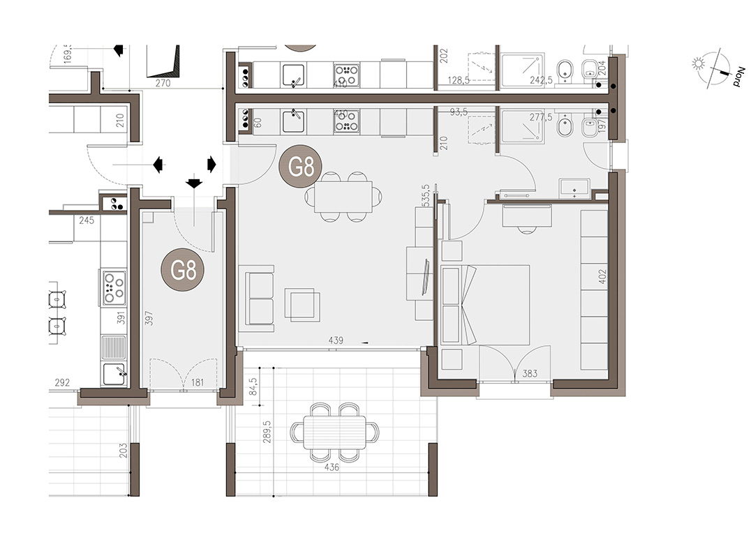 Bilocale a Piano Primo composto da soggiorno-cottura, camera, bagno, vano tecnico e disimpegno. Terrazzo di mq. 13,21. Classe energetica non inferiore ad A3 (valore di progetto indicativo).