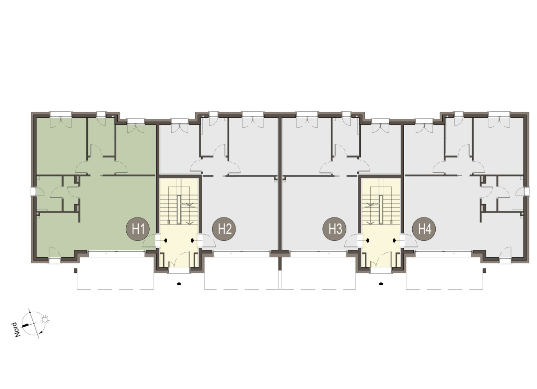 Trilocale a Piano Terra composto da soggiorno-cottura, due camere, un bagno, portico e disimpegno. Giardino di proprietà di mq. 75,08. Classe energetica non inferiore ad A3 (valore di progetto).