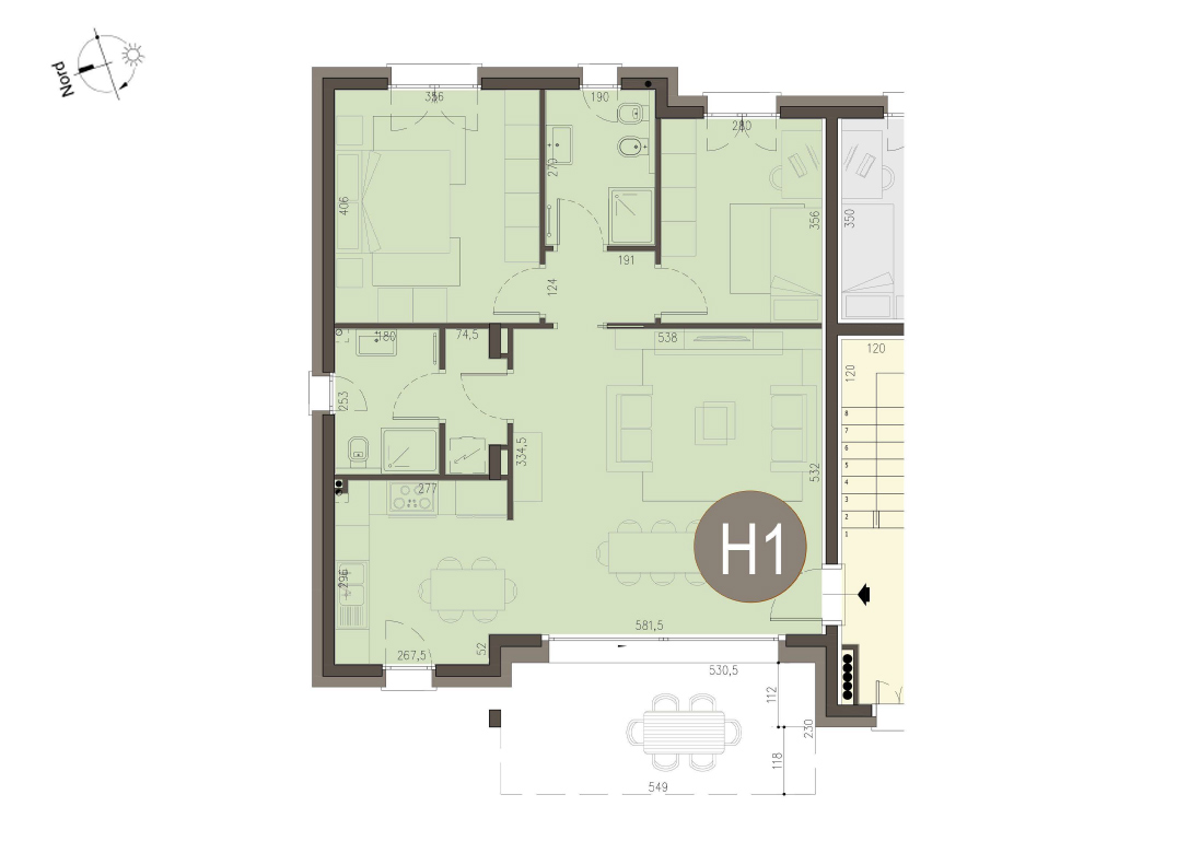 Trilocale a Piano Terra composto da soggiorno-cottura, due camere, un bagno, portico e disimpegno. Giardino di proprietà di mq. 69,10. Classe energetica non inferiore ad A3 (valore di progetto).