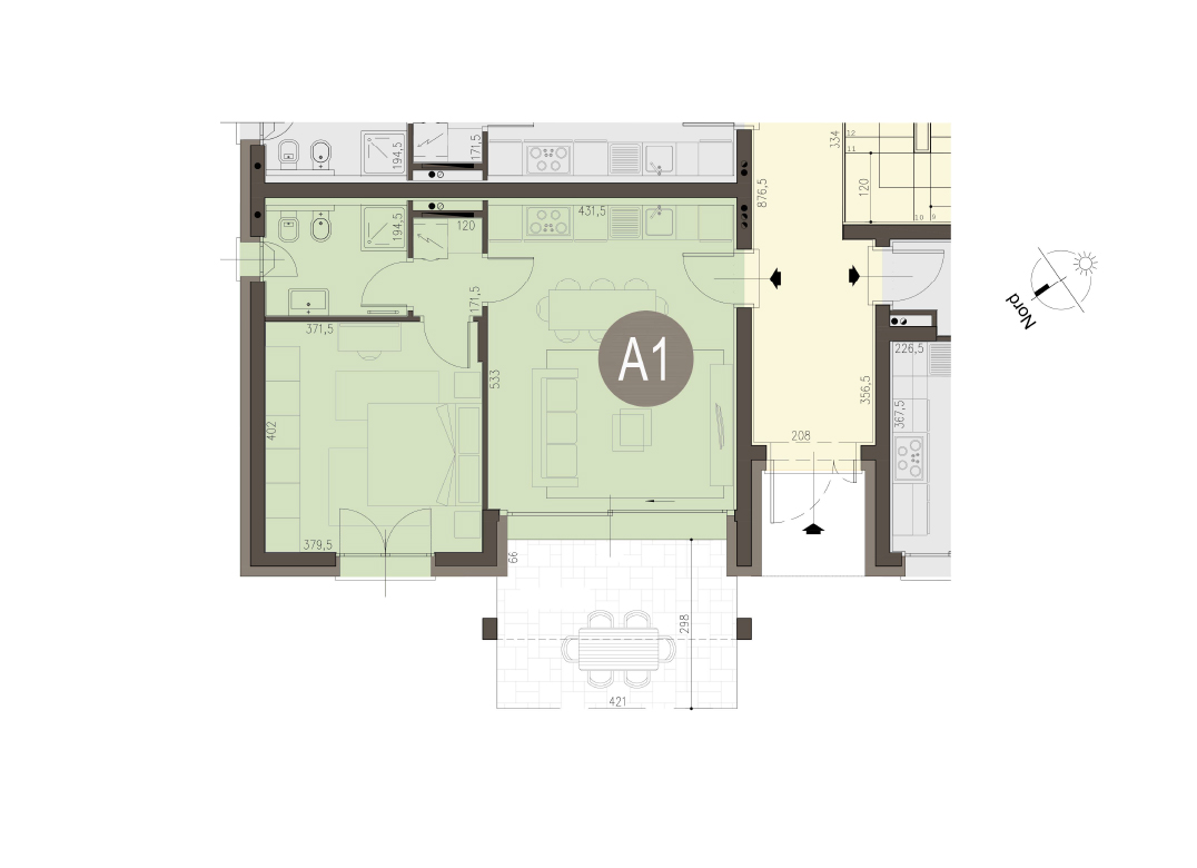 Bilocale a Piano Primo con soggiorno con angolo cottura, una camera, un bagno, disimpegno e terrazzo di 13 mq. Classe energetica A3 (valore di progetto). Le immagini e la rappresentazione grafica dei prodotti (immagini, dati tecnici e descrizioni) è realizzata al solo scopo di illustrare il prodotto ed è puramente indicativa. I prodotti possono pertanto differire da quanto rappresentato.