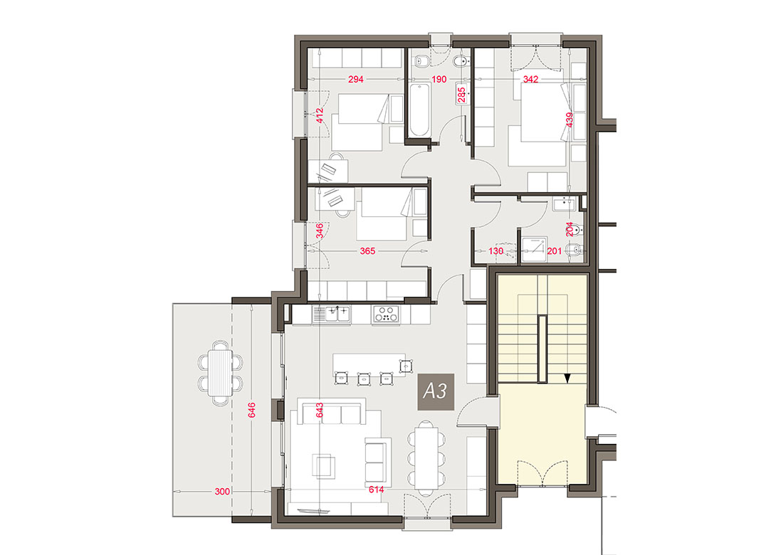 Quadrilocale al piano primo composto da soggiorno, cucina, tre camere, due bagni, terrazzo di mq. 19 e box doppio a piano interrato. Classe energetica A3, prestazione energetica 45,29 kWh/mqannuo.