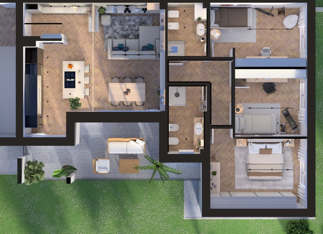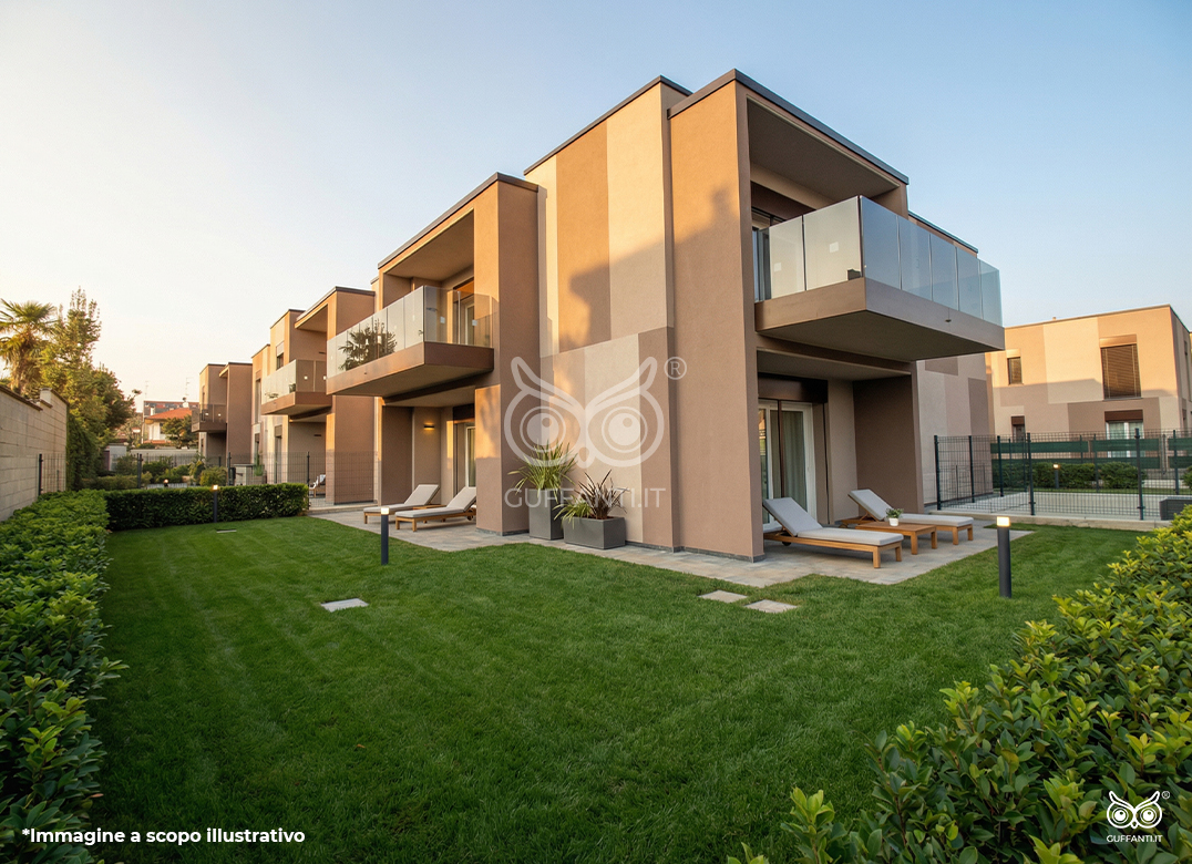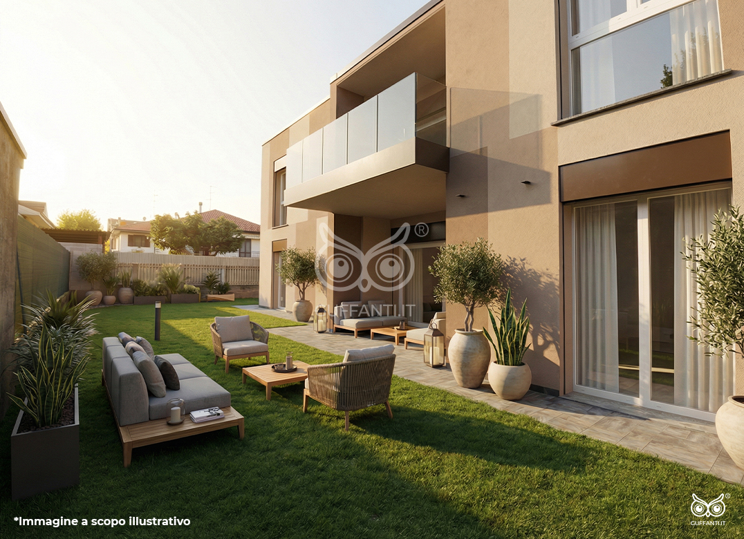 Trilocale a Piano Terra composto da soggiorno, cucina, due camere, due bagni e portico. Giardino di proprietà di mq. 155,93. Classe energetica A3, prestazione energetica 51,39 kWh/mqannuo.