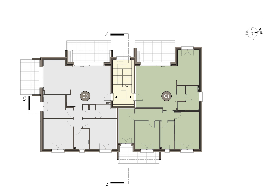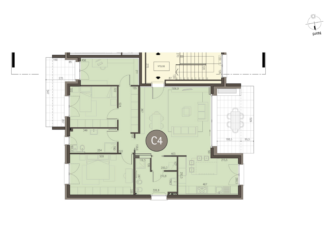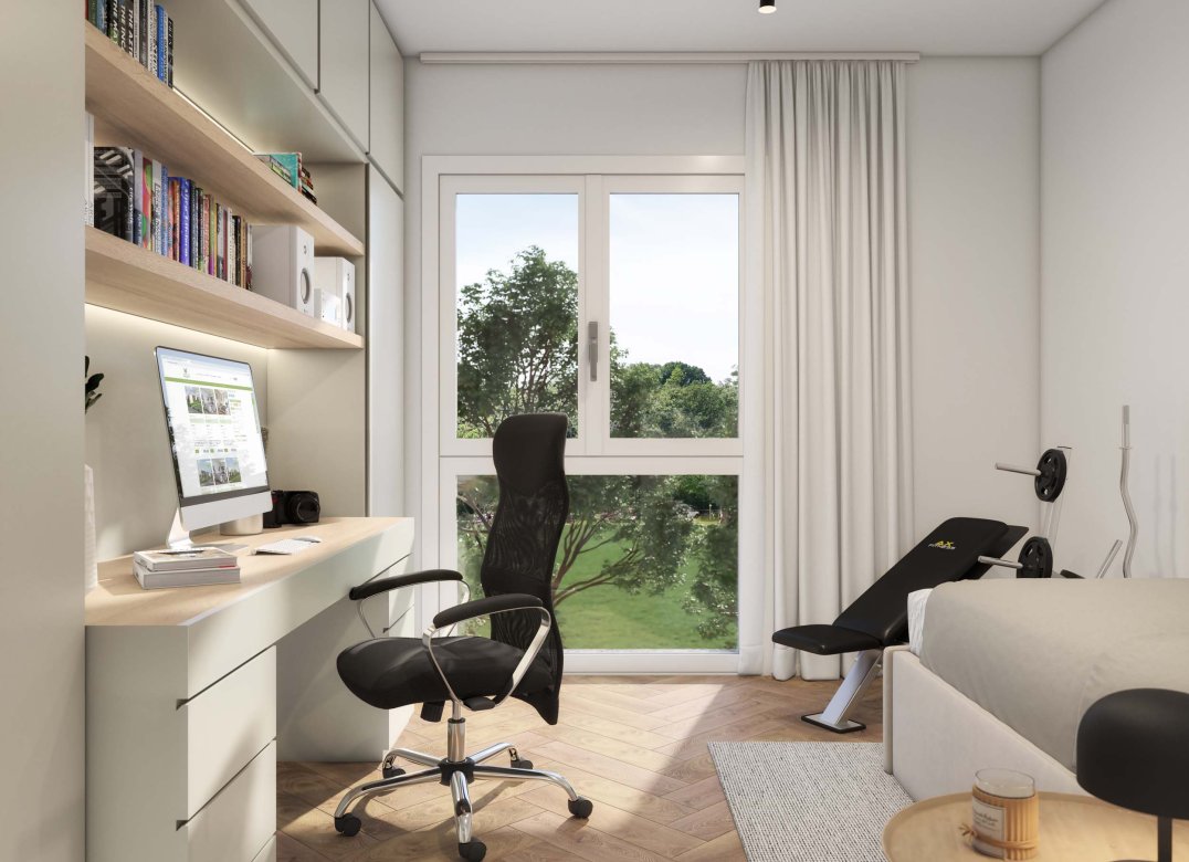 Quadrilocale a Piano Primo composto da soggiorno, cucina, due camere, studio, due bagni e due terrazzi per un totale di 24,77mq. Impianto fotovoltaico privato da 5 kw. Classe energetica A4, prestazione energetica 24,56 kWh/mqannuo.