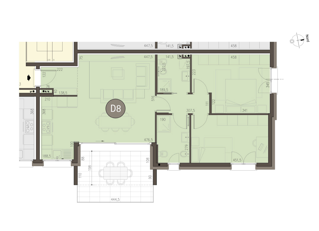 Trilocale a Piano Terra composto da soggiorno, cucina, due camere, due bagni, portico e giardino di proprietà di mq. 155,38. Classe energetica non inferiore ad A3 (valore di progetto indicativo). Prestazione energetica in fase di rilascio.