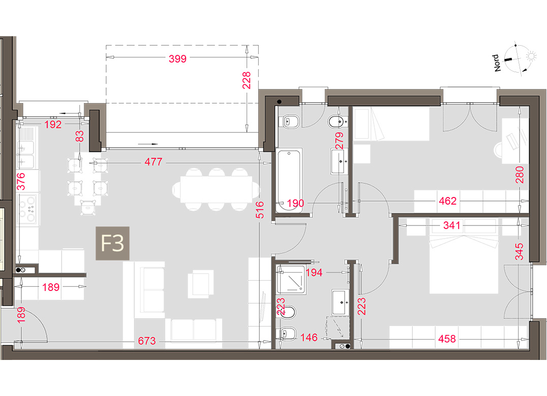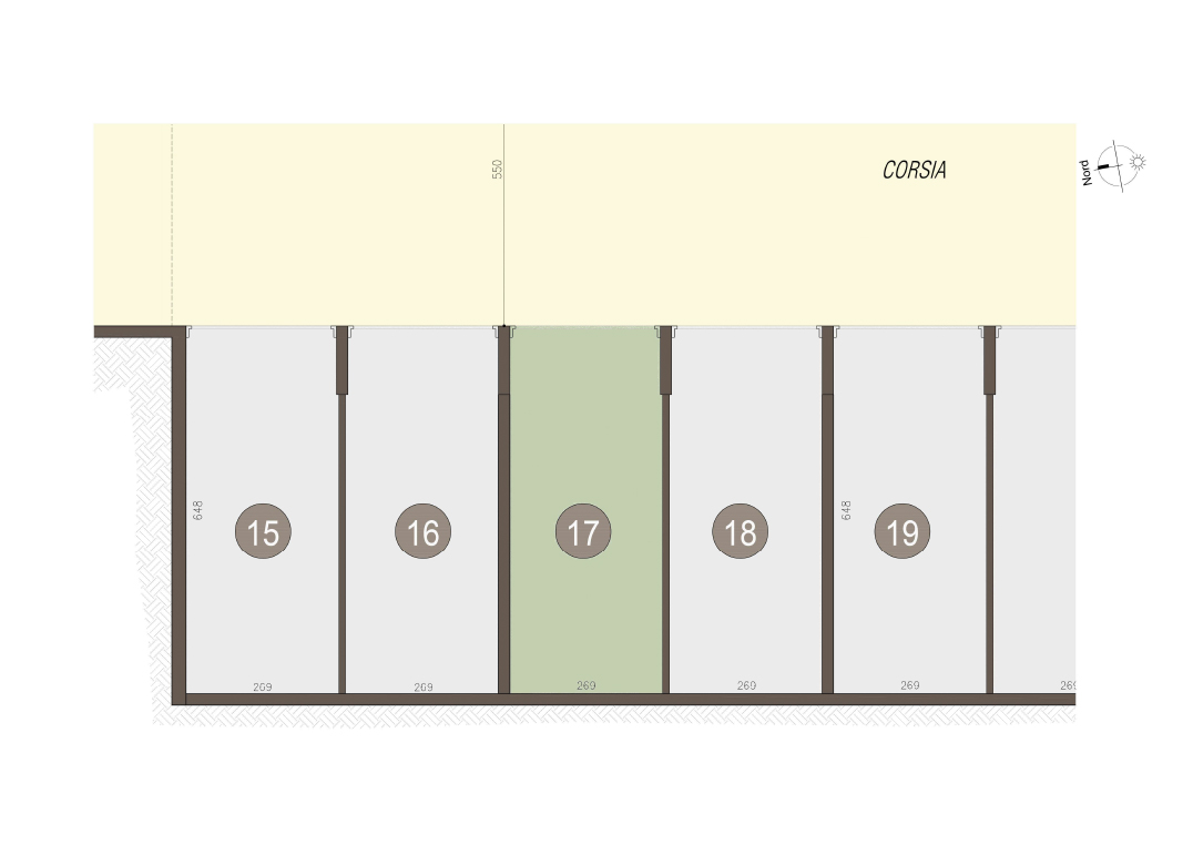 Trilocale a Piano Terra costituito da: soggiorno con angolo cottura, disimpegno, due camere, due bagni, portico e giardino di proprietà di mq 255 e box. Classe energetica A3, prestazione energetica 44,01 kWh/mqannuo.