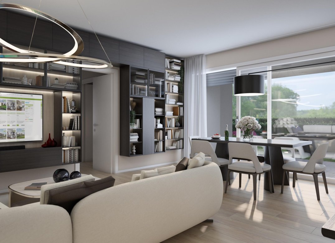 Trilocale a Piano Terra composto da soggiorno, cucina, due camere, due bagni, portico e due disimpegni. Giardino di proprietà di mq. 261,43. Classe energetica non inferiore ad A3 (valore di progetto indicativo).