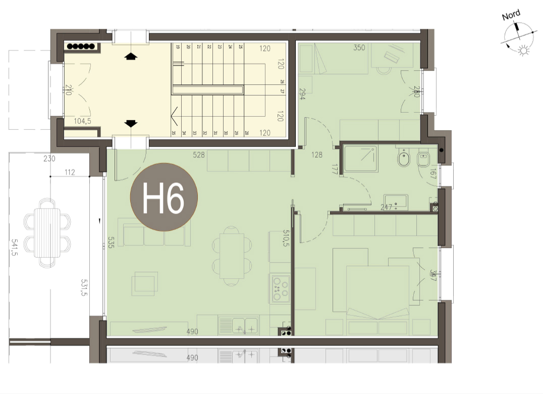 Trilocale a Piano Terra composto da soggiorno-cottura, due camere, un bagno, portico e disimpegno. Giardino di proprietà di mq. 80,17. Classe energetica non inferiore ad A3 (valore di progetto indicativo).