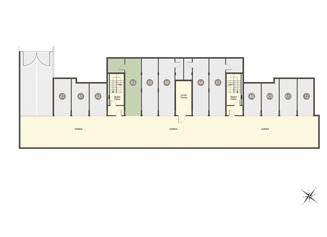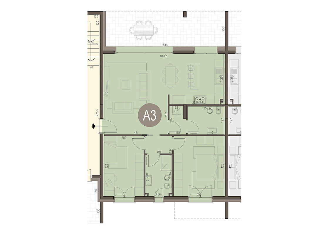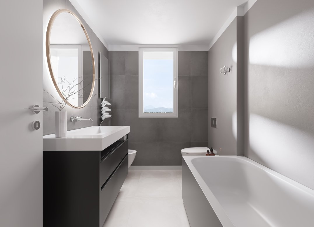 Trilocale a piano primo composto da soggiorno con cucina, due camere, disimpegni, due bagni, terrazzo di 26 mq e box doppio in lunghezza a piano interrato. Impianto fotovoltaico privato da 2 Kw. Classe energetica A3 (valore di progetto).