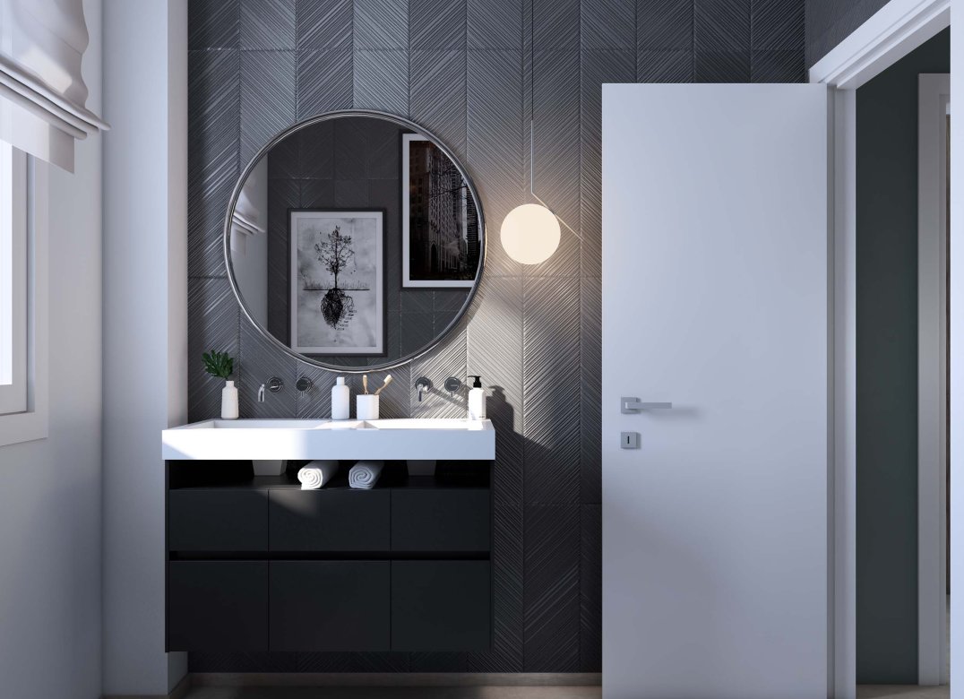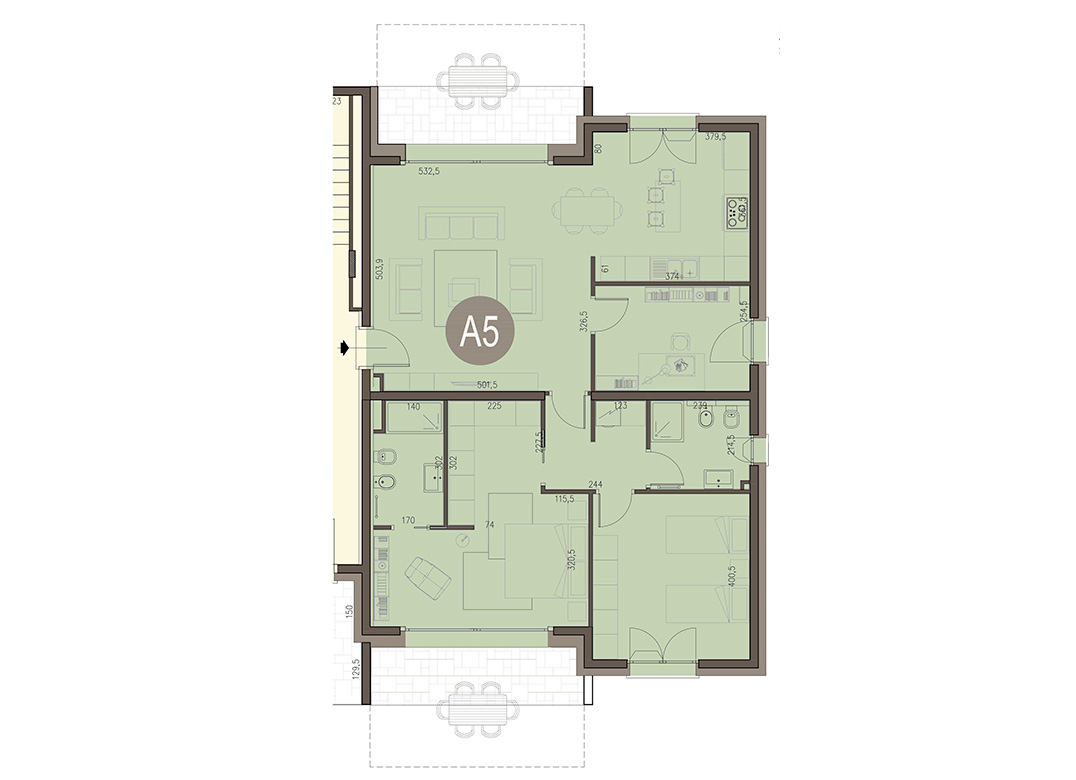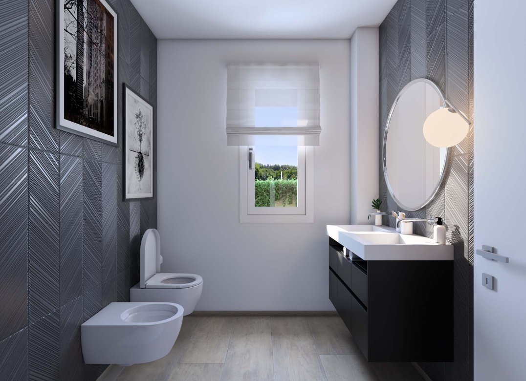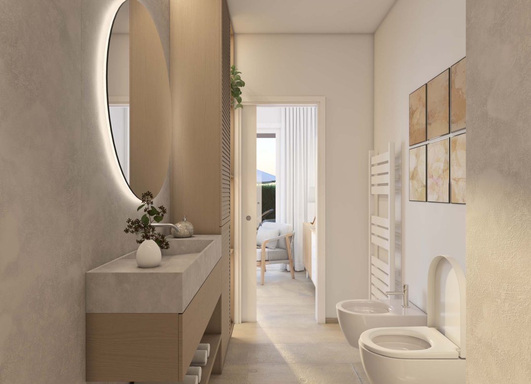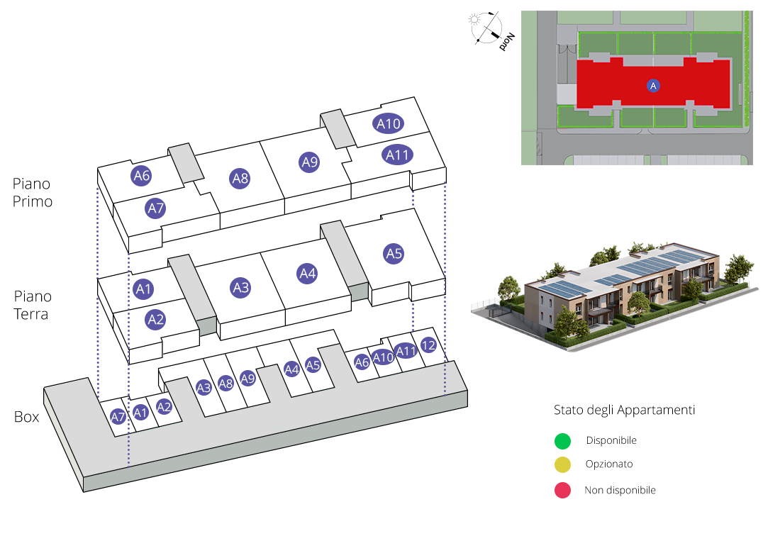 Trilocale a piano primo composto da soggiorno con cucina, due camere, disimpegni, due bagni, terrazzo di 26 mq e box doppio in lunghezza a piano interrato. Impianto fotovoltaico privato da 2 Kw. Classe energetica A3 (valore di progetto).
