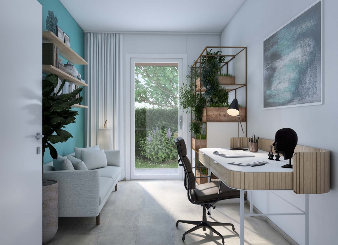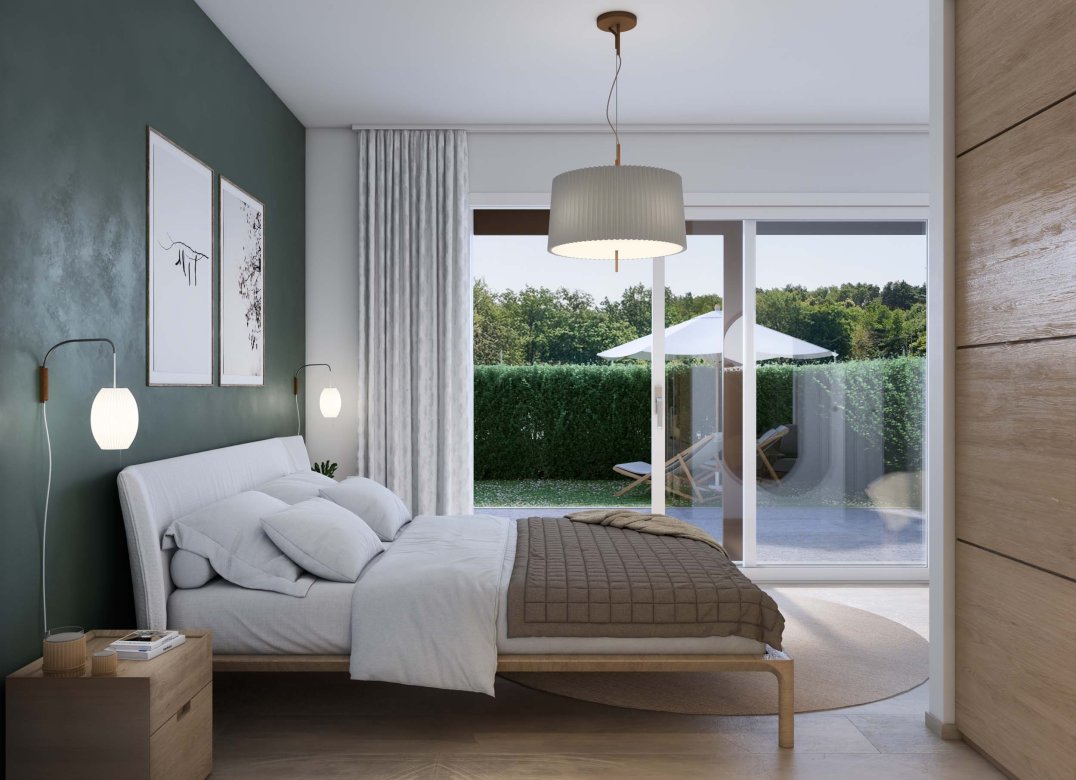 Trilocale a piano terra composto da soggiorno con cucina, due camere, disimpegni, 2 bagni, portico, giardino di proprietà di 135 mq, cantina e box doppio in lunghezza a piano interrato. Impianto fotovoltaico privato da 2 Kw. Classe energetica A3 (valore di progetto).