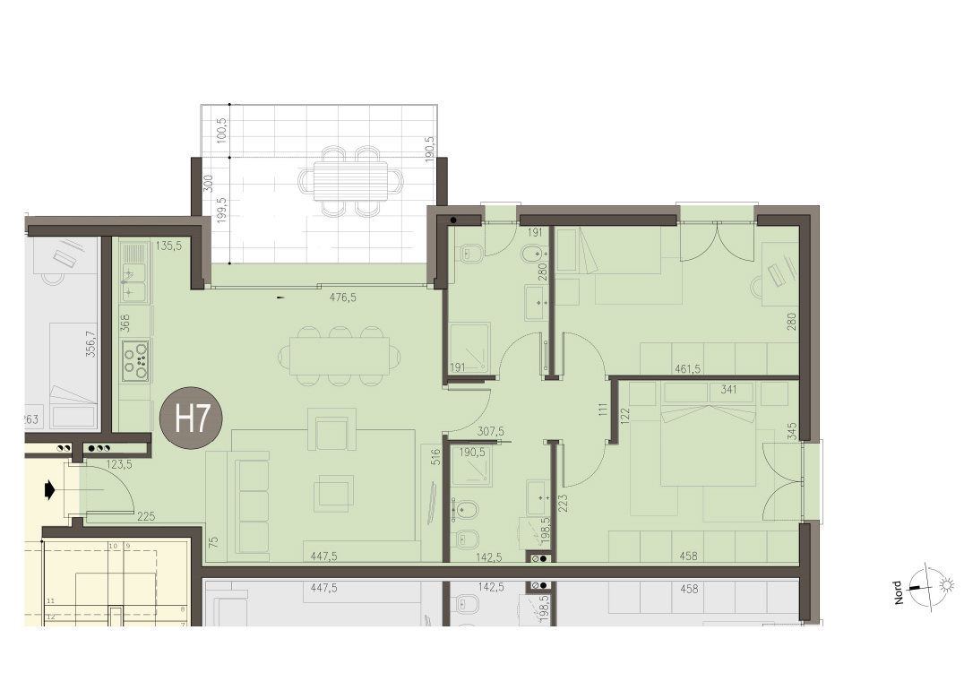 Trilocale a Piano terra con cucina/soggiorno, due camere, due bagni e balcone di 13 mq. Classe energetica A3 (valore di progetto indicativo)