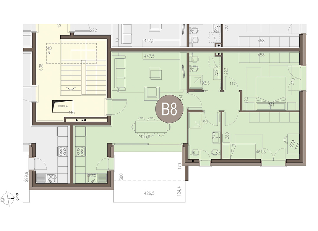 Trilocale a Piano Primo con soggiorno con angolo cottura, due camere, due bagni e terrazzo di 12,97 mq. Dotato di impianto fotovoltaico privato da 2kW. Classe energetica A4, prestazione energetica 39,84 kWh/mqannuo.