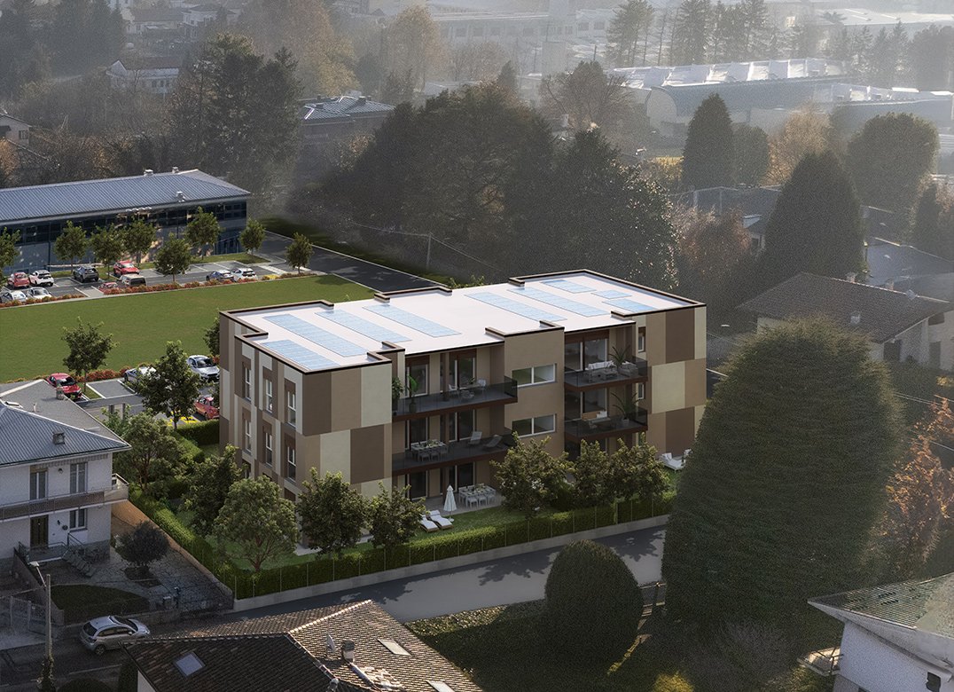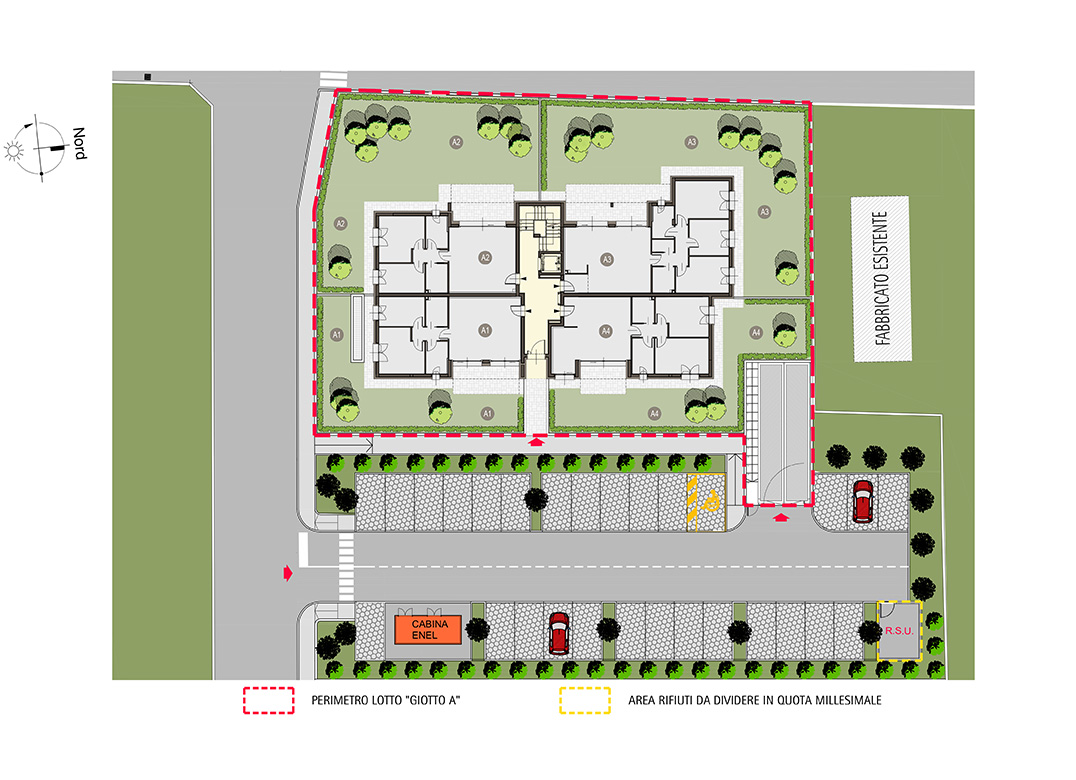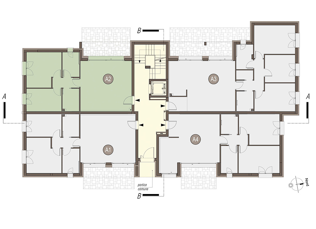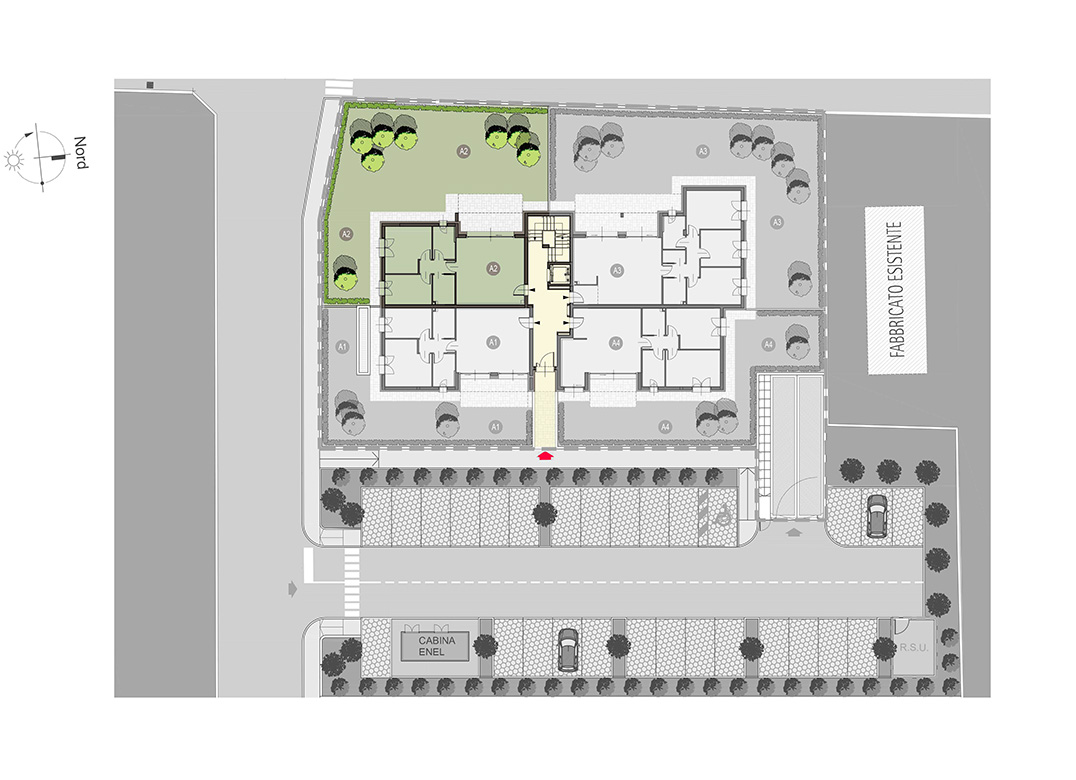 Qudrilocale a Piano Primo con soggiorno con angolo cottura, tre camere, due bagni, disimpegno e terrazzo di 25 mq. Classe energetica A3 (valore di progetto).