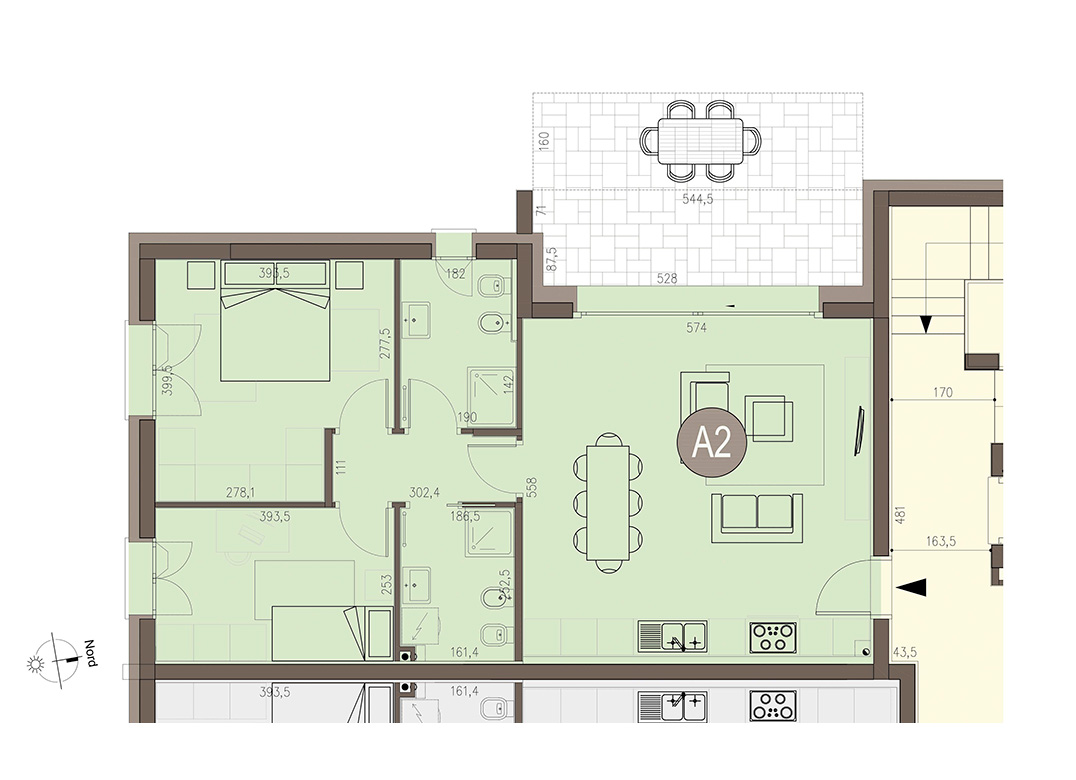 Trilocale a Piano Secondo con soggiorno con angolo cottura, due camere, due bagni e terrazzo di 10 mq. Classe energetica A3 (valore di progetto).