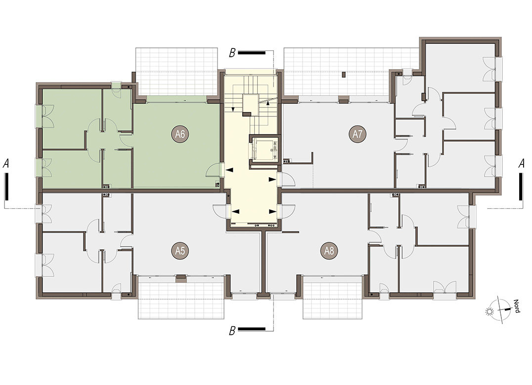 Qudrilocale a Piano Primo con soggiorno con angolo cottura, tre camere, due bagni, disimpegno e terrazzo di 25 mq. Classe energetica A (valore indicativo di progetto).