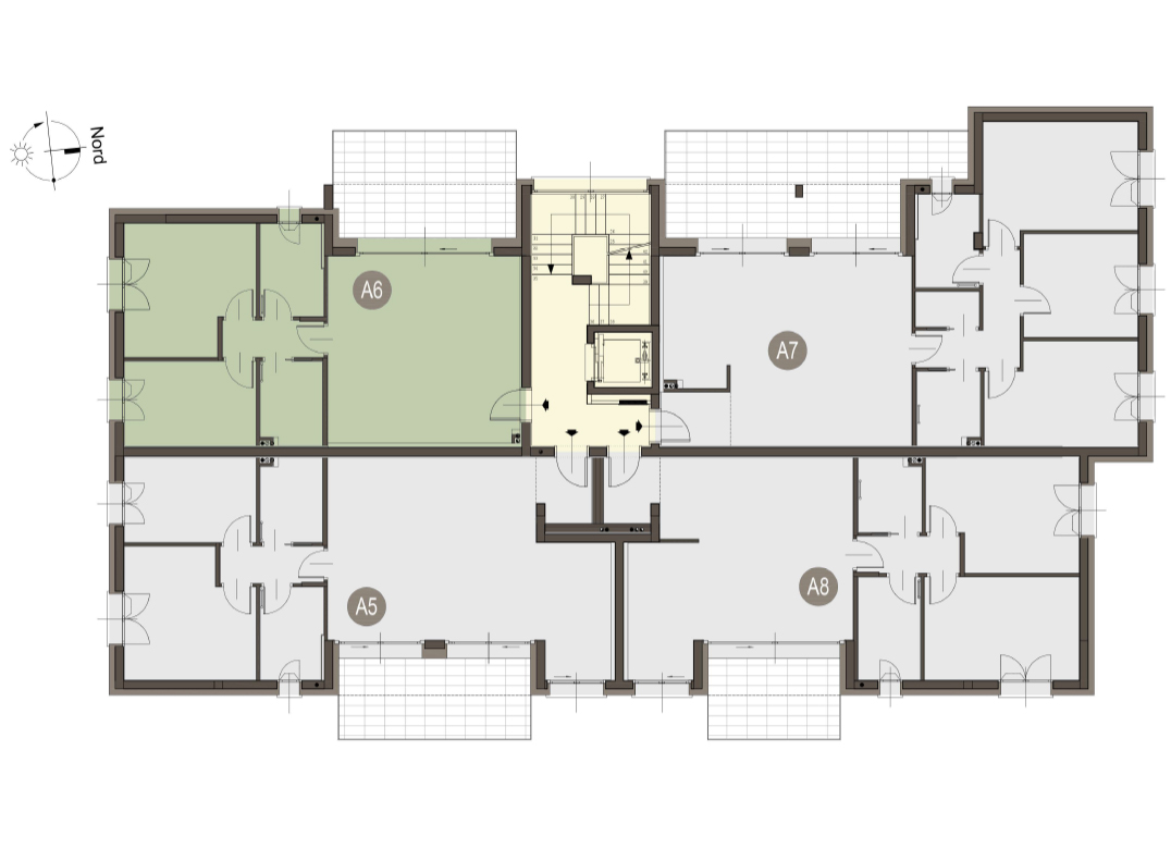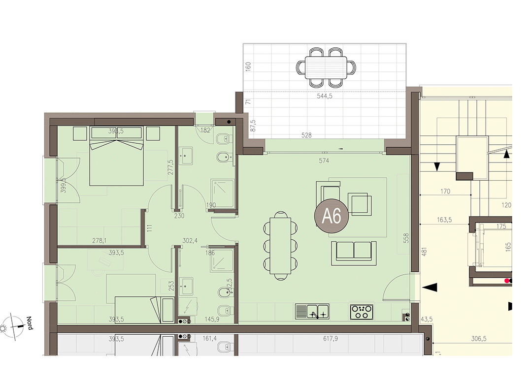 Qudrilocale a Piano Primo con soggiorno con angolo cottura, tre camere, due bagni, disimpegno e terrazzo di 25 mq. Classe energetica A3 (valore di progetto).