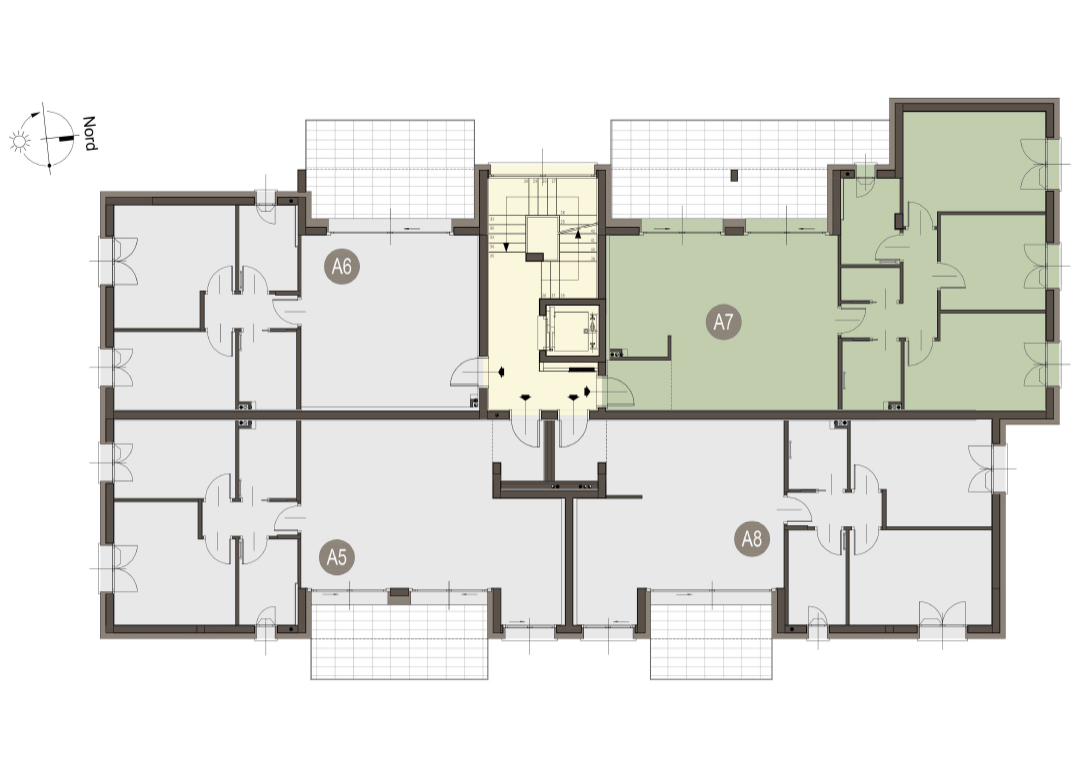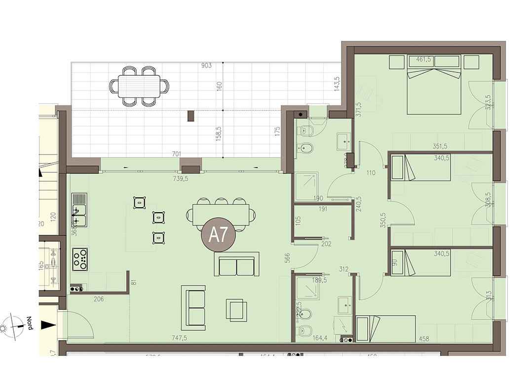 Qudrilocale a Piano Primo con soggiorno con angolo cottura, tre camere, due bagni, disimpegno e terrazzo di 25 mq. Classe energetica A3 (valore di progetto).