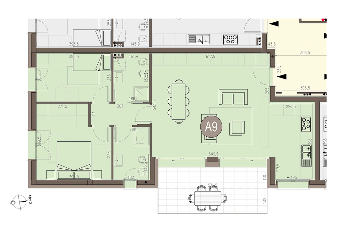 Trilocale a Piano Secondo con soggiorno con angolo cottura, due camere, due bagni e terrazzo di 14 mq. Classe energetica A (valore indicativo di progetto).