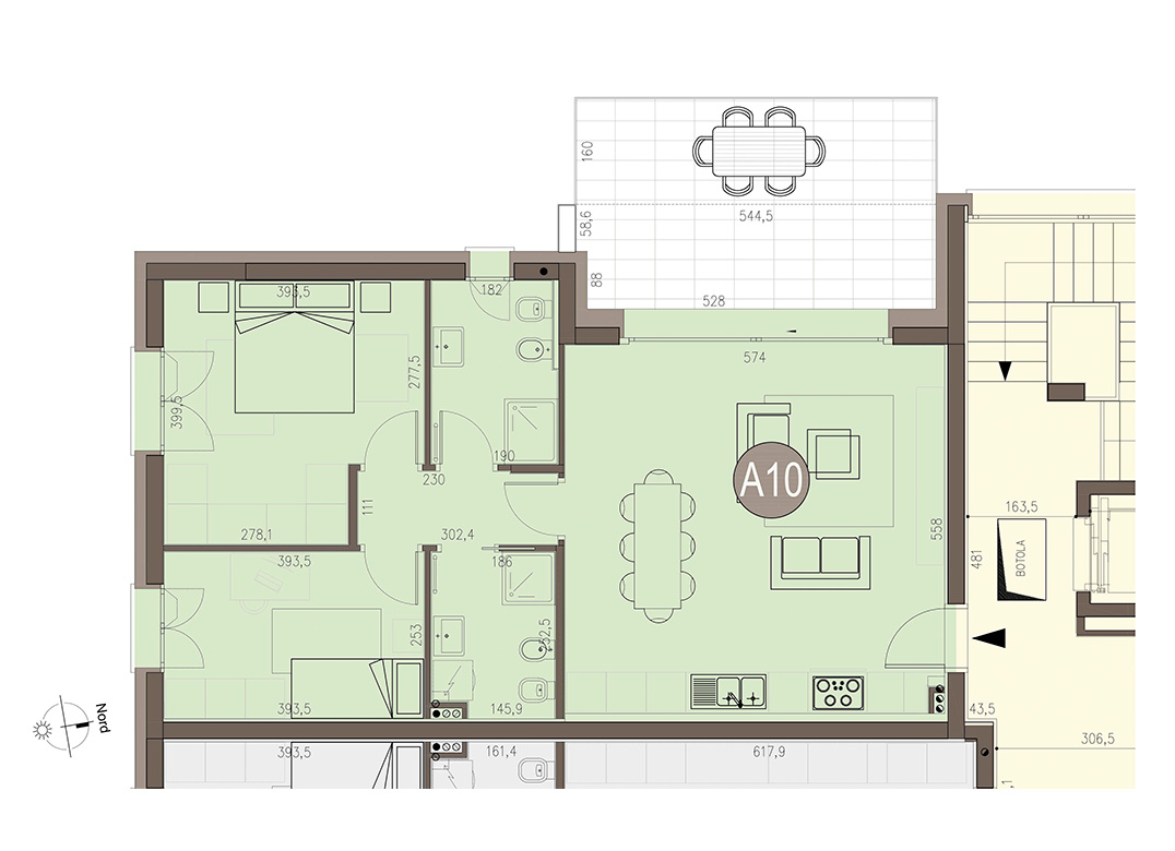 Trilocale a Piano Secondo con soggiorno con angolo cottura, due camere, due bagni e terrazzo di 10 mq. Classe energetica A3 (valore di progetto).