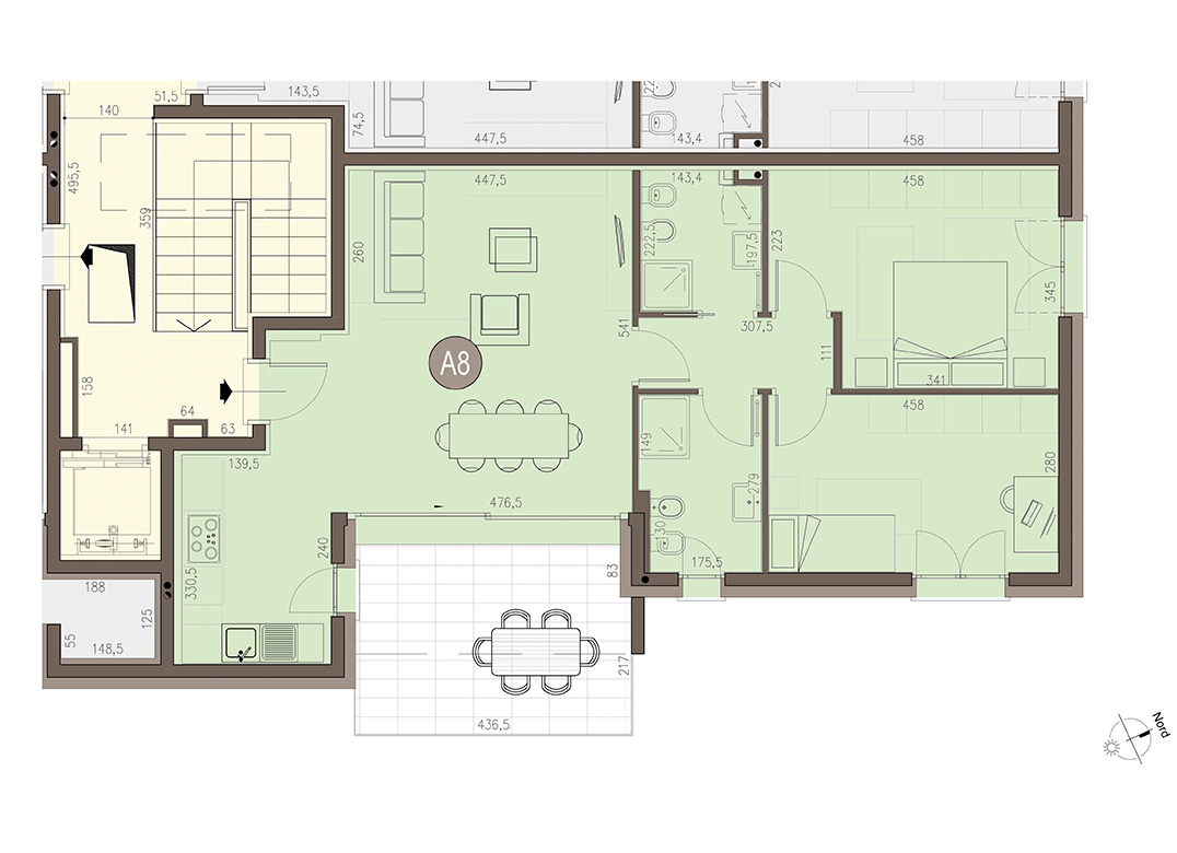 Trilocale a piano primo con soggiorno con cucina separata, due camere, due bagni, e terrazzo di 12 mq. Classe energetica A3, valore di progetto