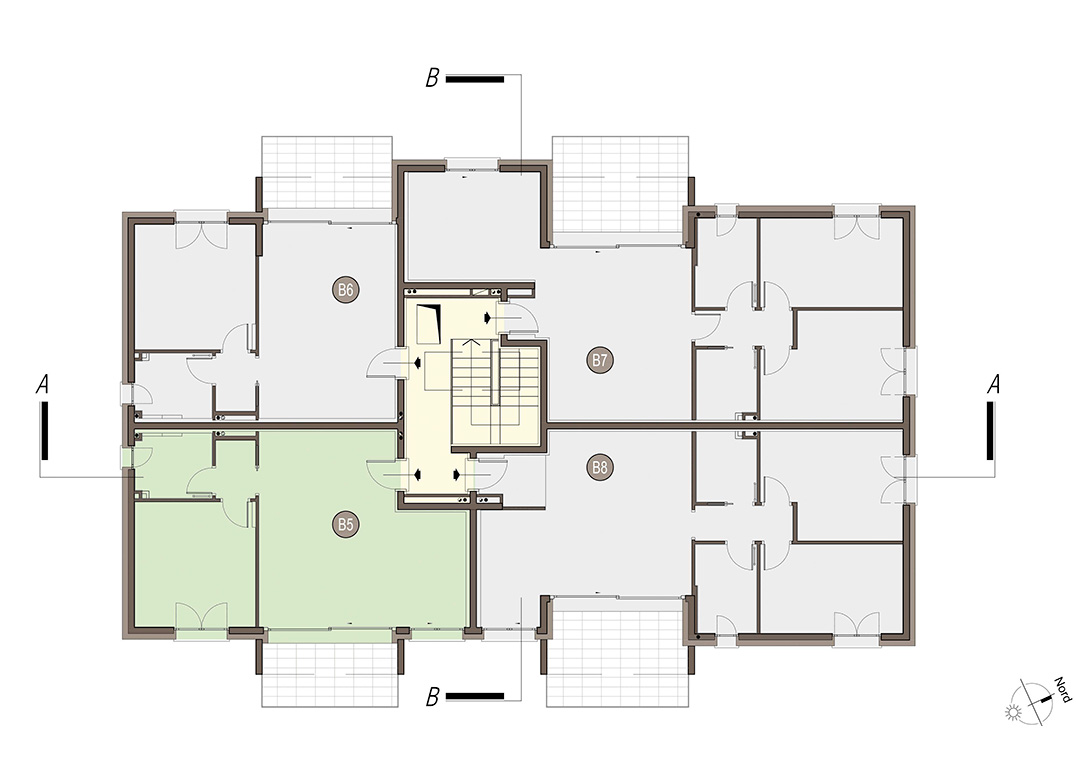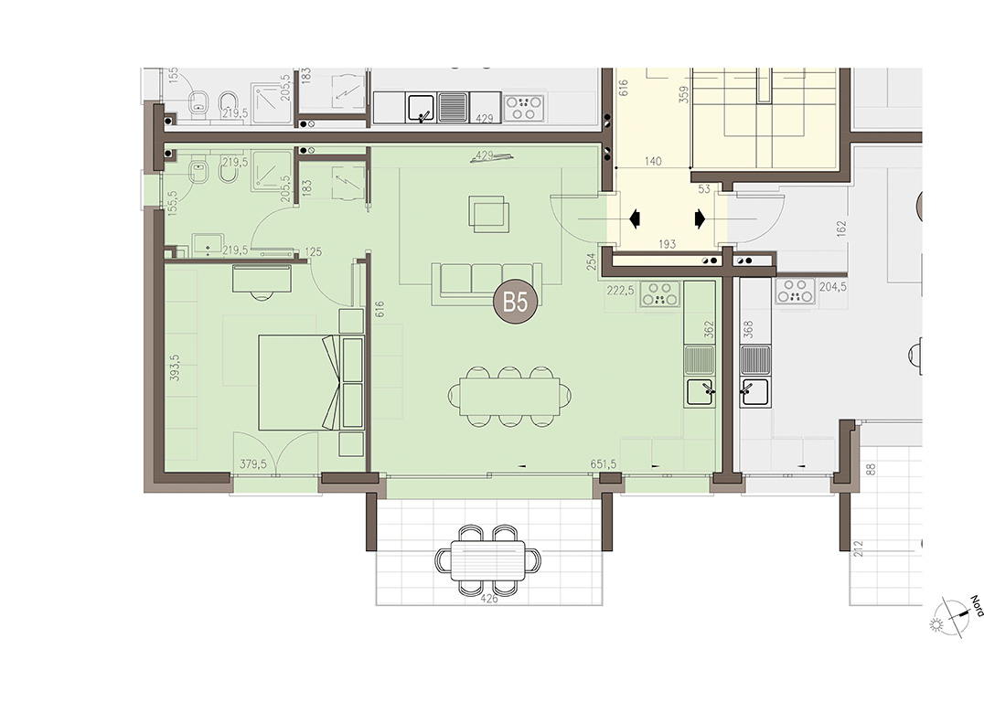 Trilocale a piano primo con soggiorno con cucina separata, due camere, due bagni, e terrazzo di 12 mq. Classe energetica A3 (valore di progetto).