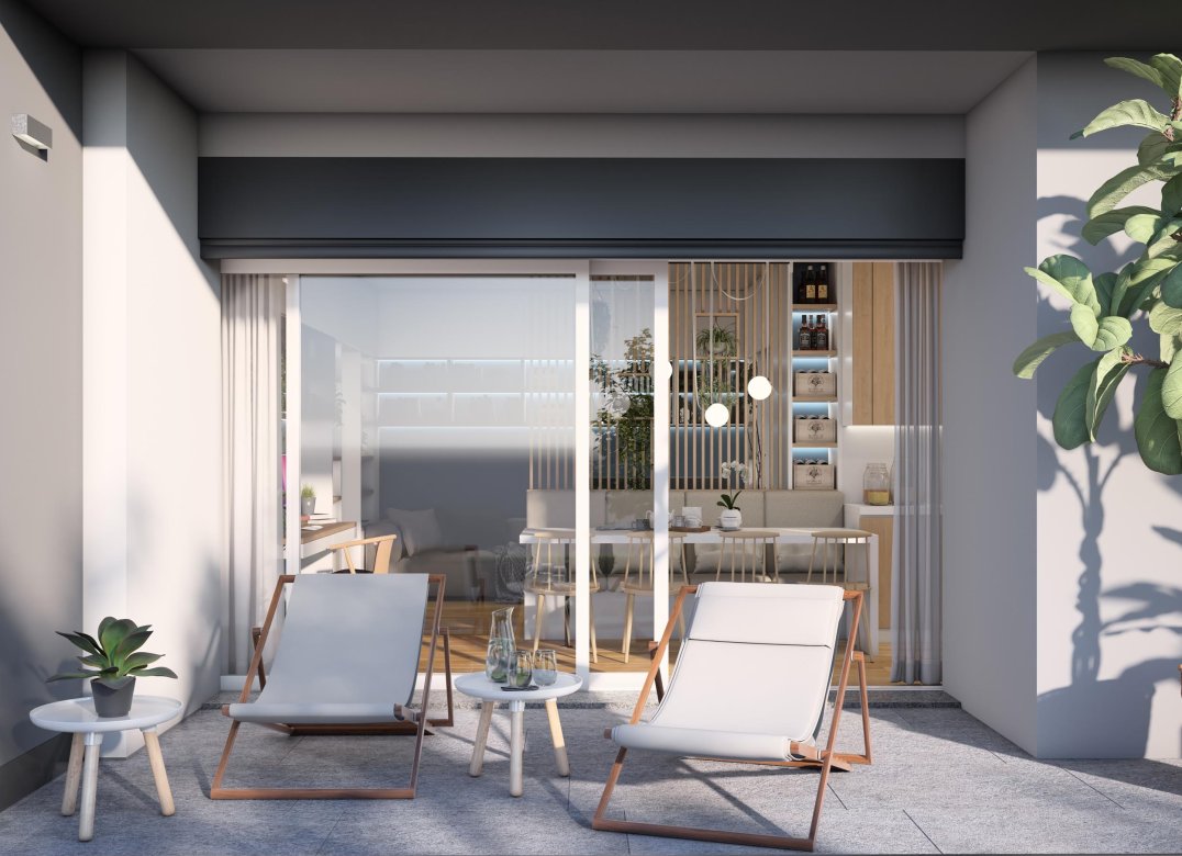 Bilocale a piano terra con soggiorno con angolo cottura una camera, un bagno, disimpegno, portico e giardino di proprietà di 67 mq. Classe energetica A3 (valore di progetto).
