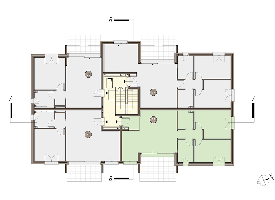 Bilocale a Piano Primo con soggiorno con angolo cottura, una camera, un bagno, disimpegno e terrazzo di 8 mq. Classe energetica A3, valore di progetto.