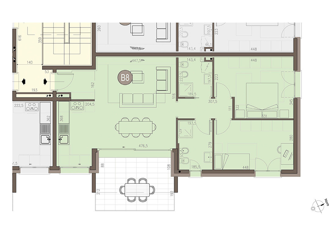 Trilocale a piano primo con soggiorno con angolo cottura, due camere, due bagni e terrazzo di 13 mq. Classe energetica A3, valore di progetto.