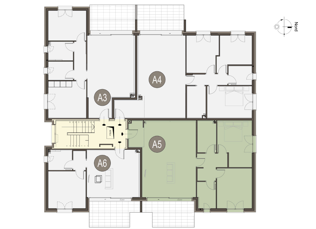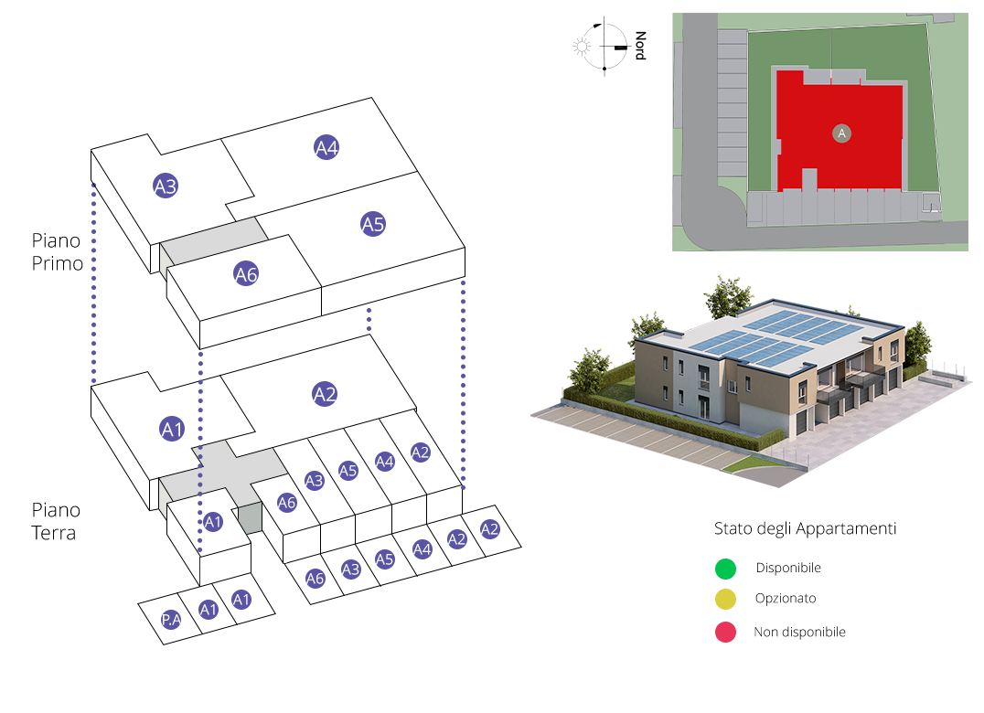 Quadrilocale a Piano Primo con soggiorno con cucina a vista, tre camere, due bagni, disimpegno, terrazzo di 12mq. box a piano terra di 24,53 mq e posto auto esterno di 16,16 mq. Dotato di impianto fotovoltaico privato da 5kW. Classe energetica A3 (valore di progetto).