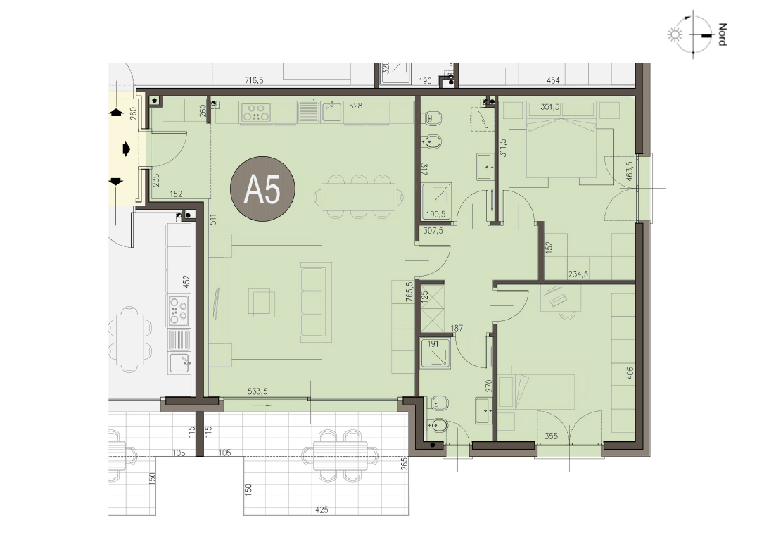 Trilocale a Piano Primo con soggiorno con cucina a vista, due camere, due bagni, disimpegno, terrazzo di 12mq. box a piano terra di 24,53 mq e posto auto esterno di 16,70 mq. Dotato di impiatno fotovoltaico privato da 5kW. Classe energetica A3 (valore di progetto).