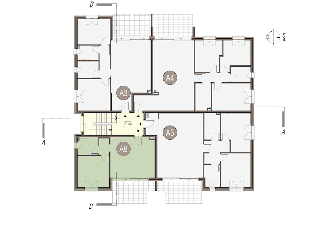Quadrilocale a Piano Primo con soggiorno con cucina a vista, tre camere, due bagni, disimpegno, terrazzo di 12mq. box a piano terra di 24,53 mq e posto auto esterno di 16,16 mq. Classe energetica A3, valore di progetto.