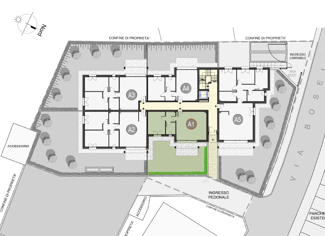 Bilocale a Piano Terra con soggiorno con cucina, camera, bagno, portico e giardino di proprietà di 66 mq. Classe energetica A3 (valore di progetto).