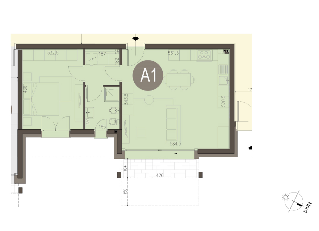 Bilocale a Piano Terra con soggiorno con cucina, camera, bagno, portico e giardino di proprietà di 66 mq. Classe energetica A3 (valore di progetto). Le immagini e la rappresentazione grafica dei prodotti (immagini, dati tecnici e descrizioni) è realizzata al solo scopo di illustrare il prodotto ed è puramente indicativa. I prodotti possono pertanto differire da quanto rappresentato.