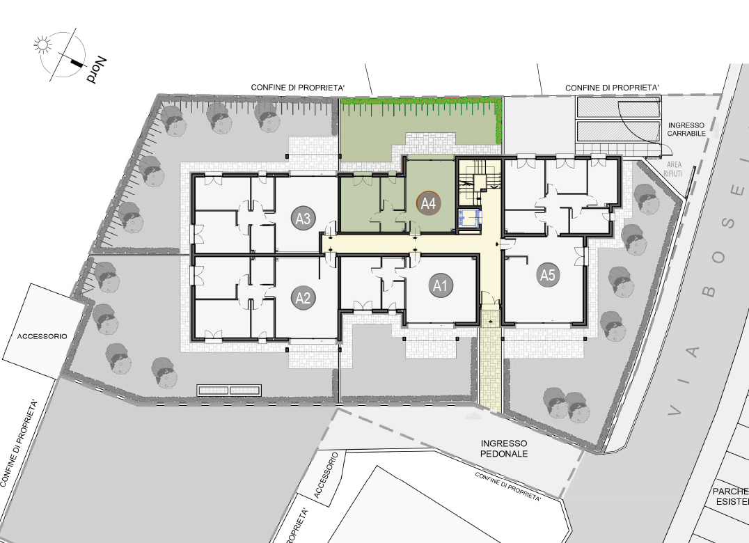 Trilocale a Piano Terra con soggiorno con angolo cottura, due camere, due bagni, portico e giardino di proprietà di 166 mq. Classe energetica A3 (valore di progetto).