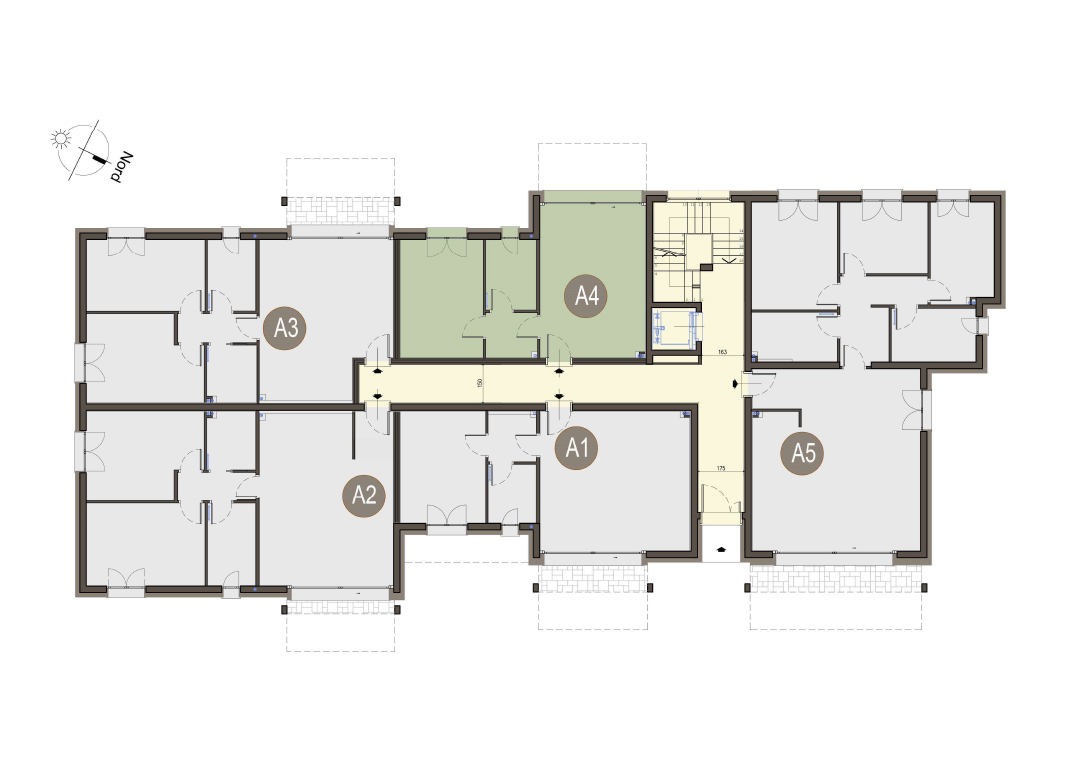 Quadrilocale a Piano Primo con soggiorno con cucina a vista, tre camere, due bagni, disimpegno e terrazzo di 17 mq. Classe energetica A3 (valore di progetto).