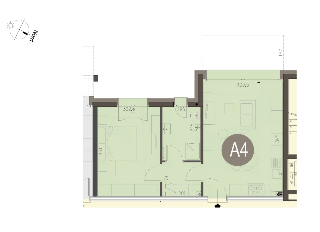 Bilocale a Piano Terra con soggirno con cucina a vista, camera, bagno, portico e giardino di proprietà di 64 mq. Classe energetica A3 (valore di progetto). Le immagini e la rappresentazione grafica dei prodotti (immagini, dati tecnici e descrizioni) è realizzata al solo scopo di illustrare il prodotto ed è puramente indicativa. I prodotti possono pertanto differire da quanto rappresentato.