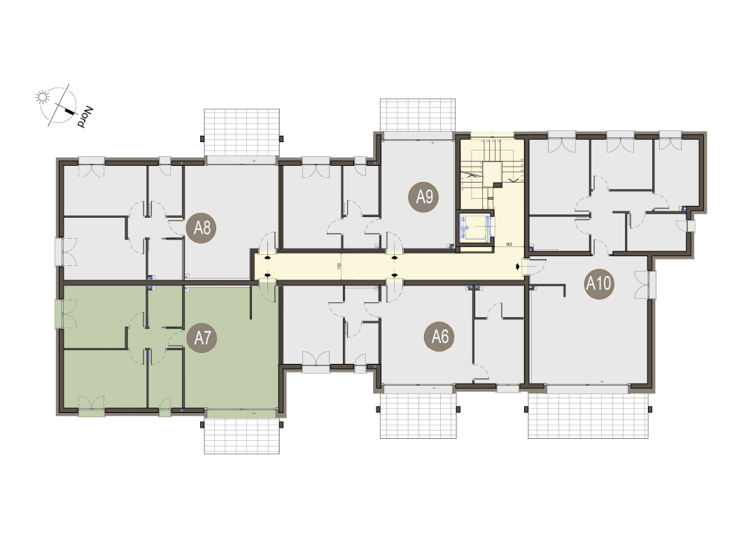 Quadrilocale a Piano Primo con soggiorno con cucina a vista, tre camere, due bagni, disimpegno e terrazzo di 17 mq. Classe energetica A3 (valore di progetto).