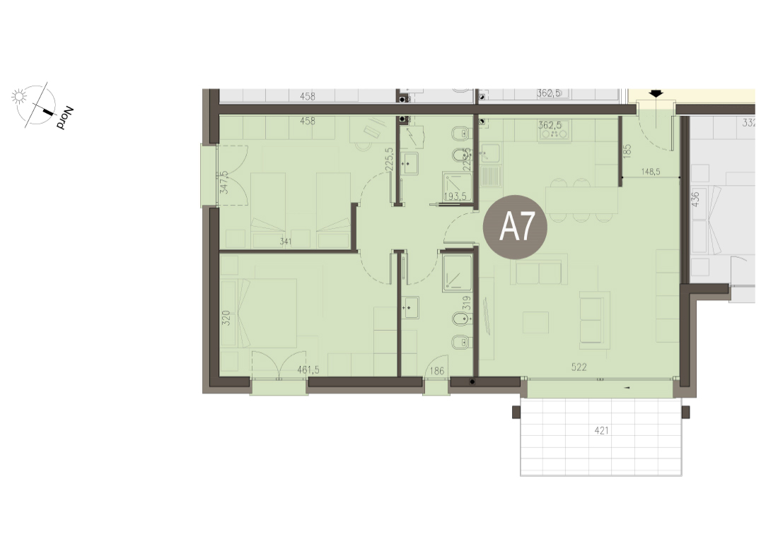 Trilocale a Piano Primo con soggiorno con angolo cottura, due camere, due bagni e terrazzo di 8 mq. Classe energetica A3 (valore di progetto). Le immagini e la rappresentazione grafica dei prodotti (immagini, dati tecnici e descrizioni) è realizzata al solo scopo di illustrare il prodotto ed è puramente indicativa. I prodotti possono pertanto differire da quanto rappresentato.