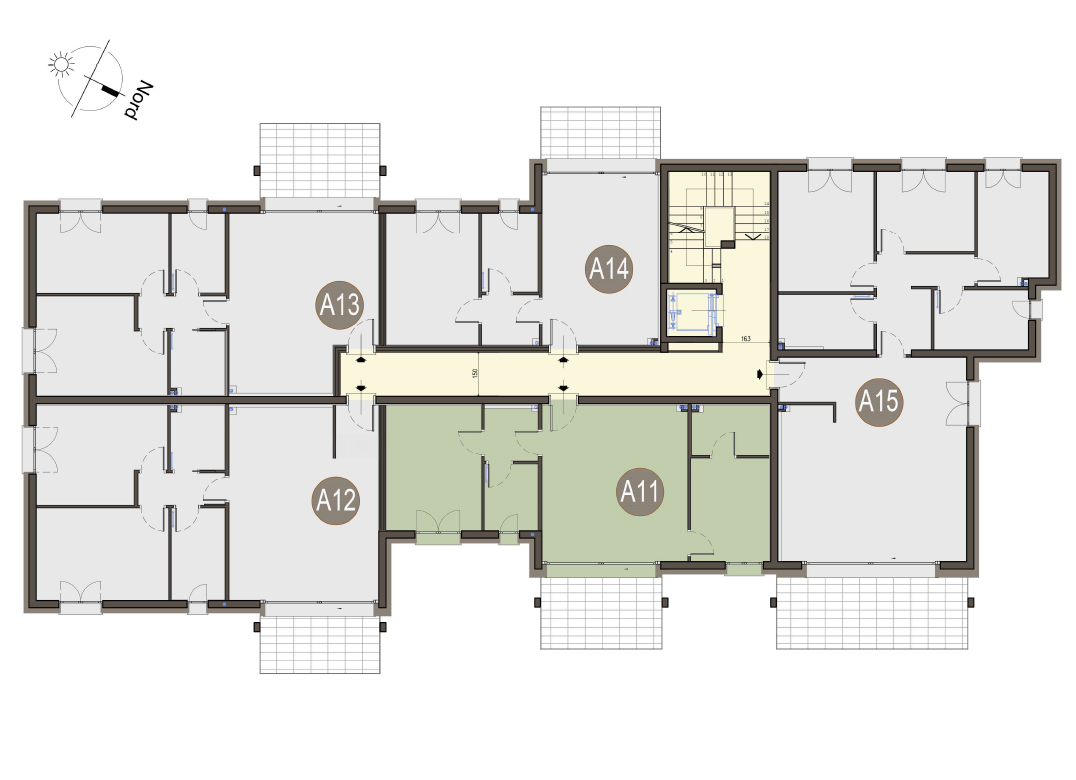 Quadrilocale a Piano Primo con soggiorno con cucina a vista, tre camere, due bagni, disimpegno e terrazzo di 17 mq. Classe energetica A3, valore di progetto