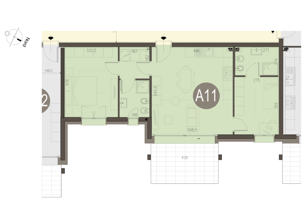 Trilocale a Piano Primo con soggiorno con angolo cottura, due camere, due bagni e terrazzo di 8 mq. Classe energetica A3 (valore di progetto).