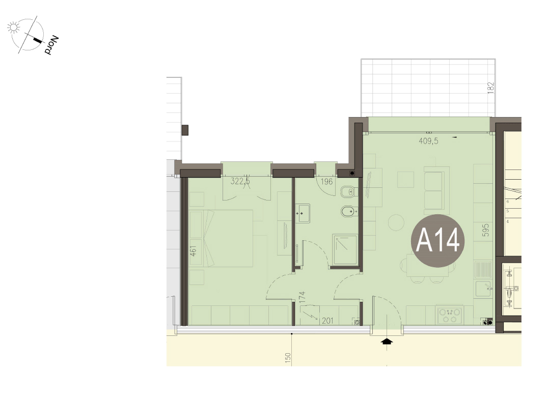 Bilocale a Piano Secondo con soggiorno con cucina a vista, una camera, bagno e terrazzo di 8 mq. Classe energetica A3 (valore di progetto). Le immagini e la rappresentazione grafica dei prodotti (immagini, dati tecnici e descrizioni) è realizzata al solo scopo di illustrare il prodotto ed è puramente indicativa. I prodotti possono pertanto differire da quanto rappresentato.