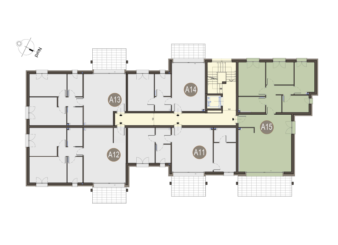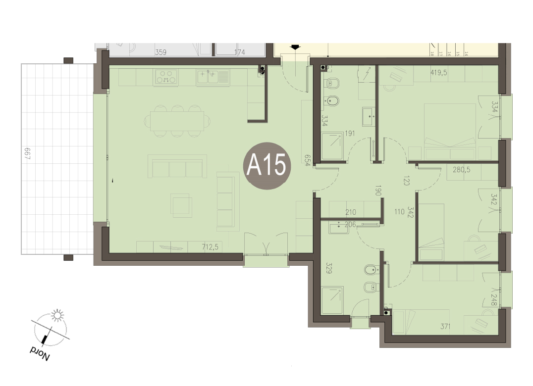 Quadrilocale a Piano Primo con soggiorno con cucina a vista, tre camere, due bagni, disimpegno e terrazzo di 17 mq. Classe energetica A3 (valore di progetto).