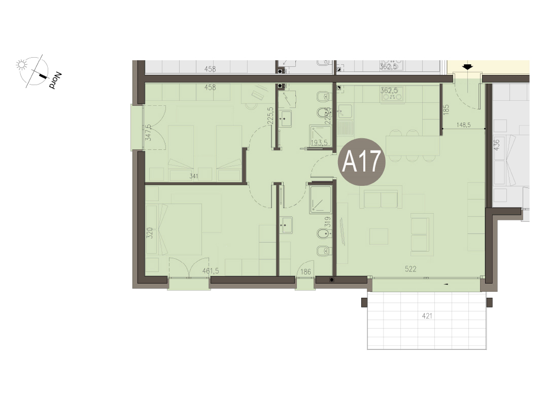 Trilocale a Piano Primo con soggiorno con angolo cottura, due camere, due bagni e terrazzo di 8 mq. Classe energetica A3, valore di progetto