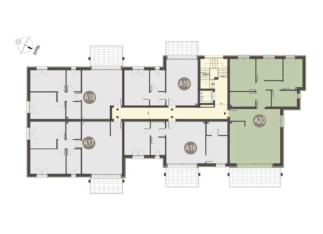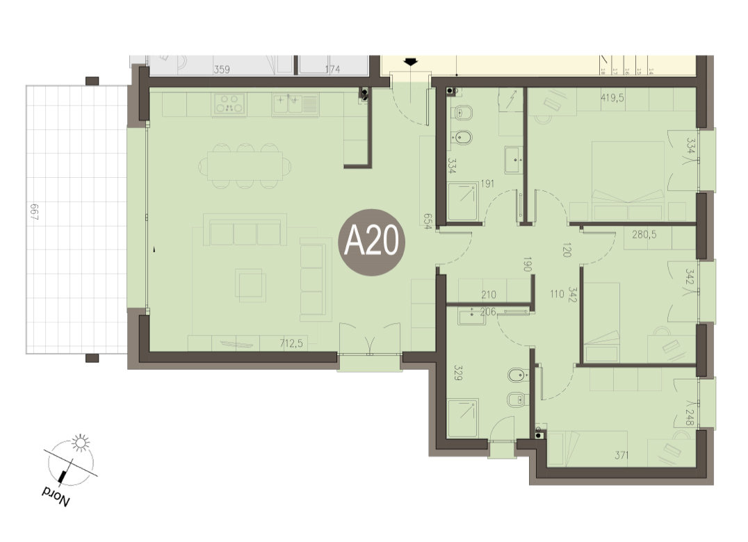 Quadrilocale a Piano Primo con soggiorno con cucina a vista, tre camere, due bagni, disimpegno e terrazzo di 17 mq. Classe energetica A3 (valore di progetto).