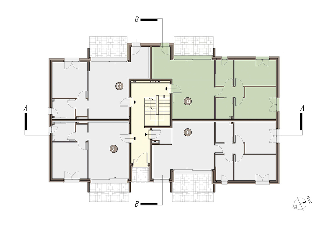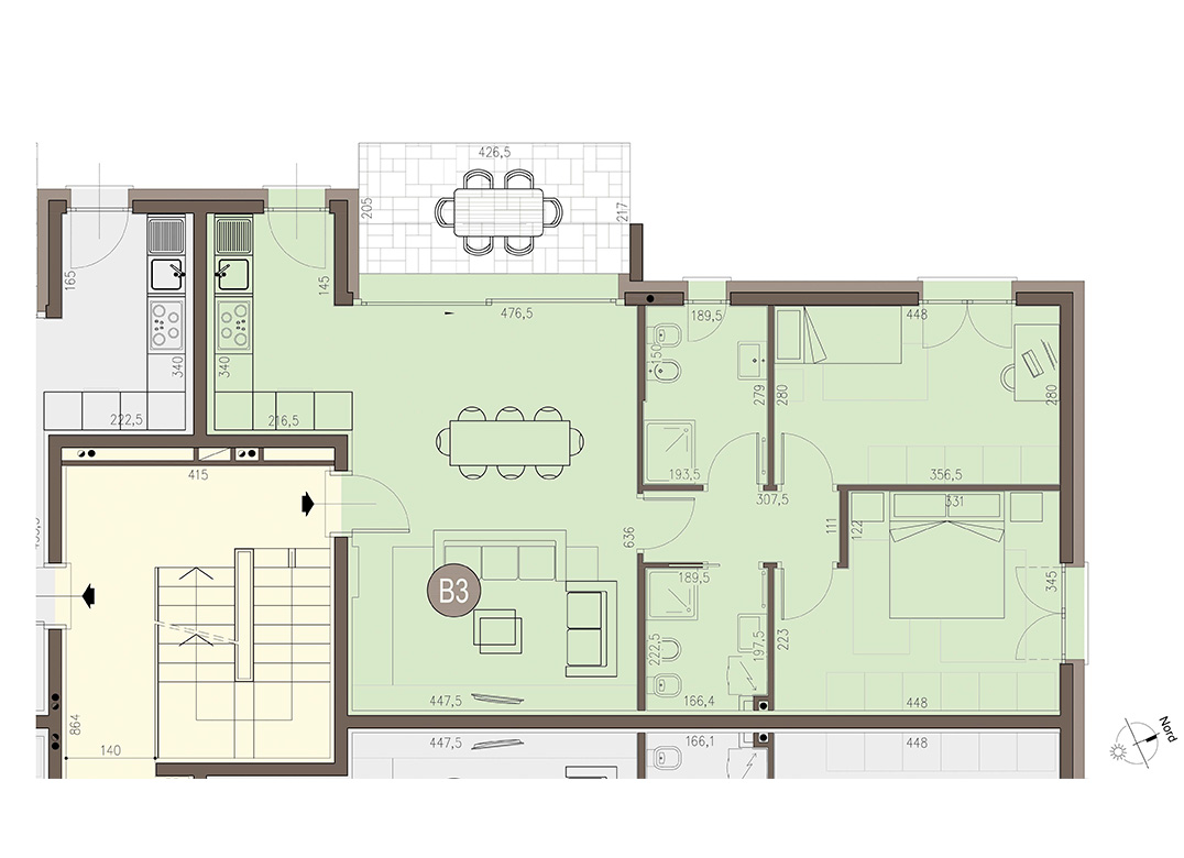 Trilocale a piano primo con soggiorno con cucina separata, due camere, due bagni, e terrazzo di 12 mq. Classe energetica A3 (valore di progetto).