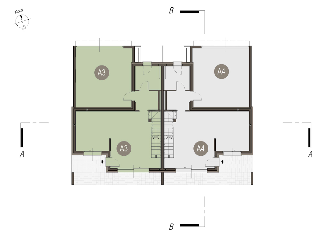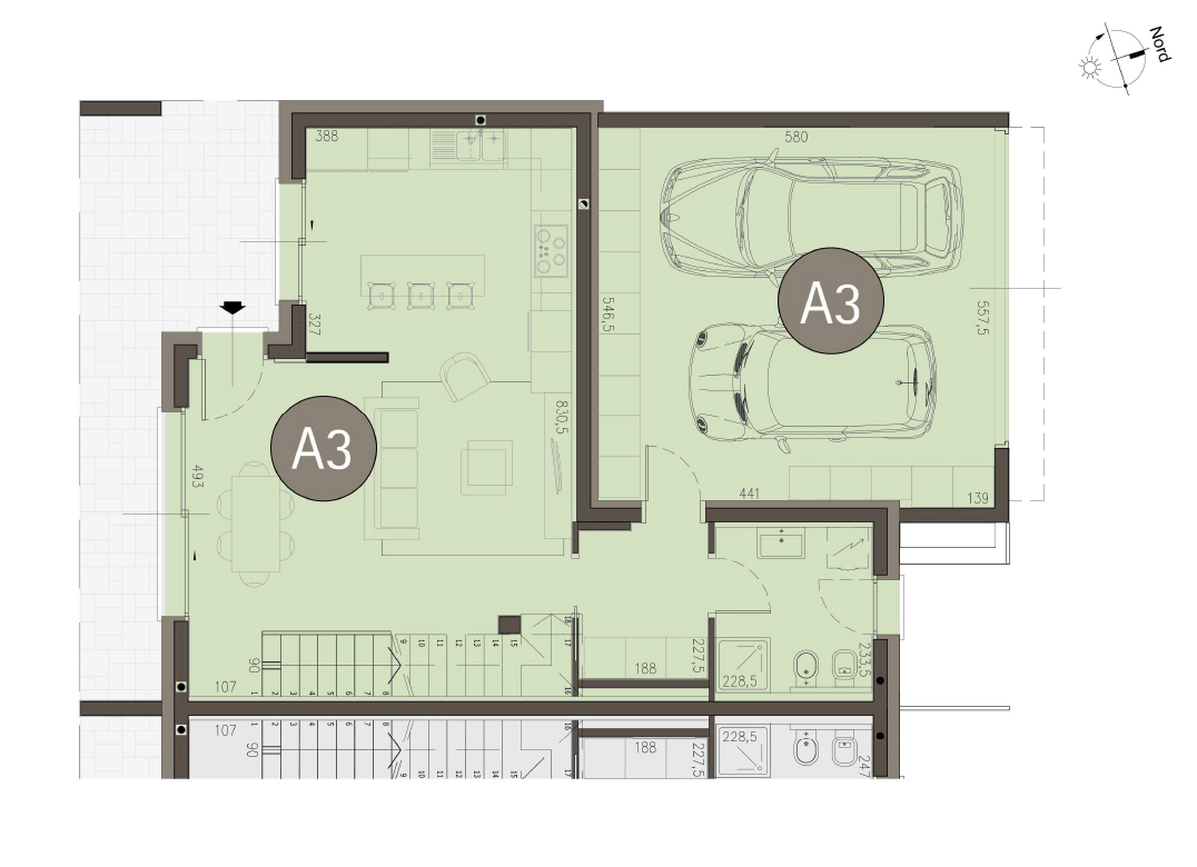 Villa Bifamiliare con cucina con soggiorno, tre camere, due bagni, ingresso, terrazzo, portico, giardino di proprietà di 80 mq, box doppio e posto auto. Impianto fotovoltaico privato da 6,5 kw. Classe energetica A3 (valore di progetto).