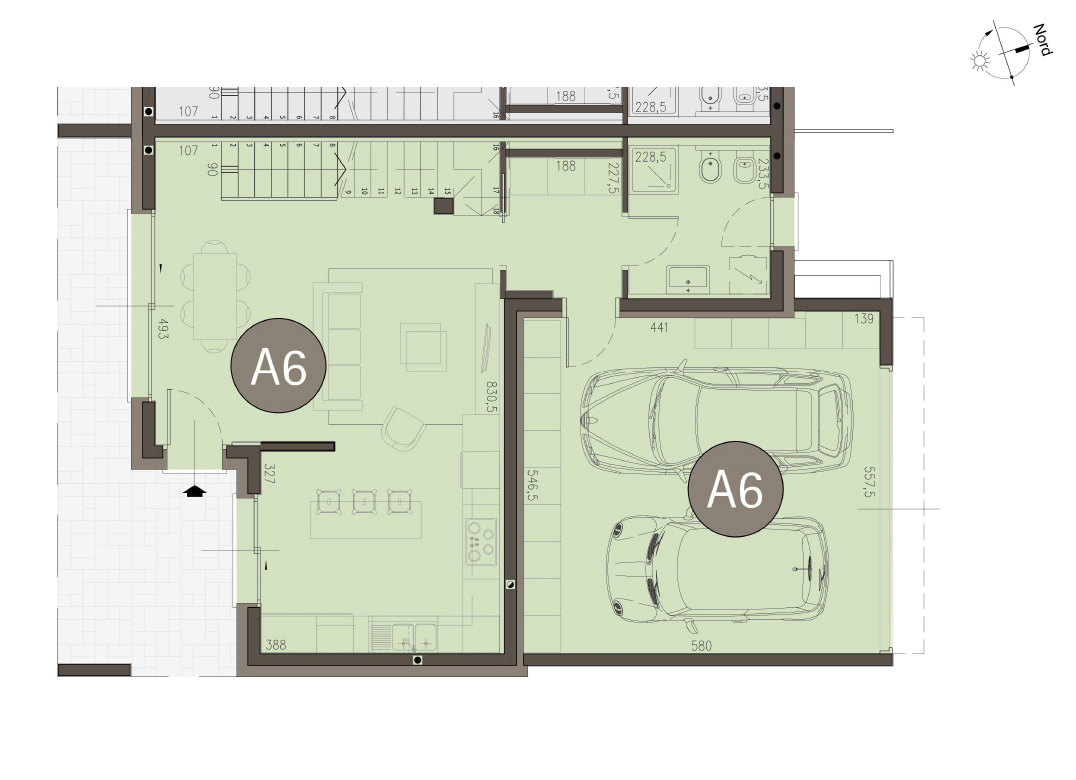 Villa Bifamiliare con cucina con soggiorno, tre camere, due bagni, ingresso, terrazzo, portico, giardino di proprietà di 80 mq, box doppio e posto auto. Impianto fotovoltaico privato da 6,5 kw. Classe energetica A3 (valore di progetto).