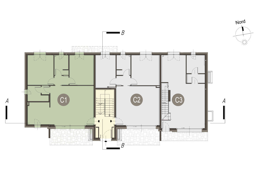 Trilocale a piano primo con soggiorno/cucina, due camere, un bagno, disimpegno, terrazzo di 14mq. Classe energetica A3 valore di progetto.
